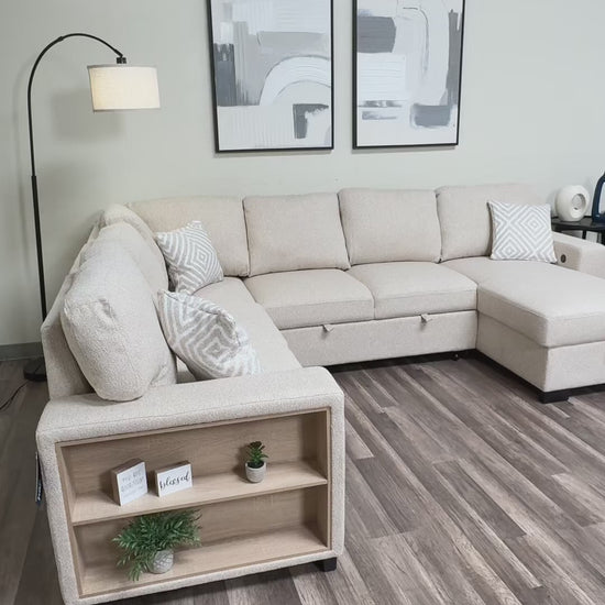 This super comfy couch has 2 convenient storage areas, a pullout sleeper, USB-C Charging, Cup holders, and more.